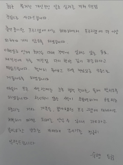 다만 그는 "아울러 모든 사실관계는 추후 법적 절차를 통해 밝히도록 하겠다"며 "확인되지 않은 사실이 무분별하게 유포되는 행위는 저와 가족들, 참가했던 프로그램에 대해서도 회복하기 어려운 피해를 안길 수 있으니 과도하고 불필요한 보도는 자제해 주시기를 정중히 부탁드린다"고 덧붙였다.