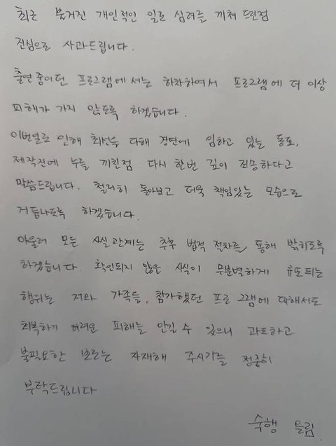 유부남과의 상간 혐의로 피소된 유명 트로트 가수로 지목된 숙행이 자필 사과문을 공개하며 출연 중이던 프로그램에서 전격 하차했습니다.