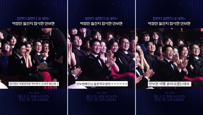 올해 청룡영화상에서 가장 뜨거운 화제를 모은 '국민 전남친' 박정민과 가수 화사의 '굿 굿바이(Good Goddbye)' 축하공연에 대한 비하인드도 빠질 수 없었다. 좌석 1열에서 박정민과 화사의 구두 퍼포먼스를 직관했던 안보현은 그 누구보다 축하공연에 빠져들어 입을 다물지 못한 채 연신 함박 웃음을 터트렸고 공연 내내 박수를 치며 역대급 몰입도와 리액션을 선보여 팬들에게 또 다른 재미를 선사했다. 안보현의 리액션 영상을 본 많은 팬은 '박정민 돌잔치에 참석한 안보현이다' '안보현은 박정민과 악수 후 수줍은 소녀가 됐다' '안보현의 입틀막 반응이 너무 웃기다' '안보현 너무 웃어서 이가 쏟아지겠다' 등 폭발적인 댓글이 쏟아졌다.이와 관련해 안보현은 "아마 내 수상 영상보다 '박정민 돌잔치 온 안보현' 쇼츠를 더 많이 모니터했던 것 같다. 시상식 때는 그렇게 많은 내부자가 곳곳에 숨어 있는 줄 몰랐다. 수상 못지않게 전혀 예상을 못 했던 부분이고 아무래도 덩치가 제일 큰 사람이 1열 앞자리에 앉아 너무 빠져들어 직관하는 모습이 유독 눈에 띄었던 것 같다. 정민 선배의 돌잔치에 참석할 계획은 아니었는데, 그렇게 됐다"고 머쓱해했다.