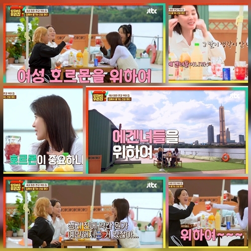 막내 가비가 석류즙을 활용한 ‘석류 스파클링’을 준비하자, 김성령은 잔을 들며 “여성 호르몬을 위하여”라고 건배사를 외쳐 현장을 웃음바다로 만들었다. 이에 하지원은 “에스트로겐으로 하자, 우아하게”라며 받아쳤고, 김성령은 곧바로 “에겐녀들을 위하여”라고 응수하며 분위기를 이끌었다.