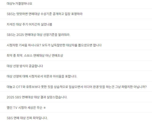 2025 SBS 연예대상 시청자 게시판그런 가운데 일부 시청자들 사이에서는 대상을 둘러싸고 불만 목소리가 쏟아졌다. 시상식 내내 지석진 수상을 암시하는 듯한 연출이 이어진 가운데 정작 대상 발표에서 이름이 불리지 않자 허탈감이 커졌다는 반응이다. 특히 지석진은 최근 모친상을 겪은 상황에서도 가발 분장을 흔쾌히 받아들이는 등 프로다운 태도를 보여 아쉬움을 남겼다.