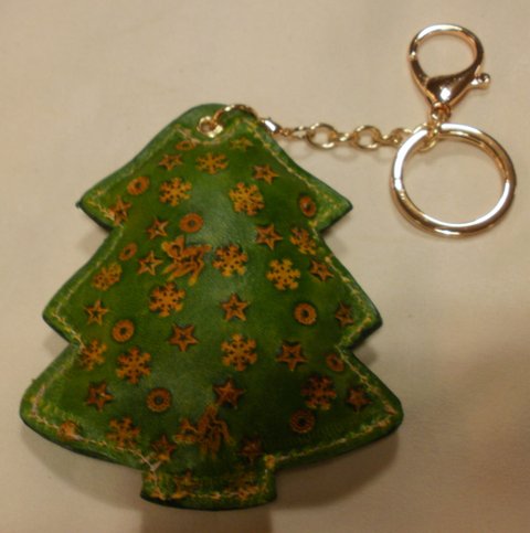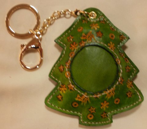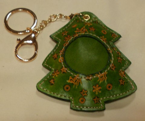 베지터블 내추럴 가죽에 스탬핑하고 천연 염색하여 제작한 크리스마스 트리형 키링입니다.원형 안에는 사진이나 케릭터 등을 부착하여 키링이나 패션 소품,가방 장식,액세서리 등으로 사용할 수 있도록 하였습니다.(마디샤)