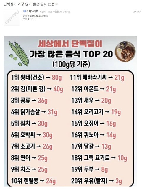 단백질이 가장 많이 들은 음식 20선