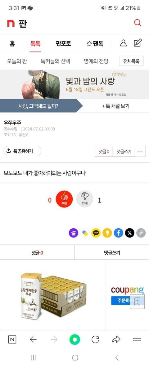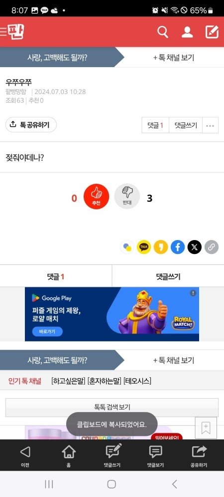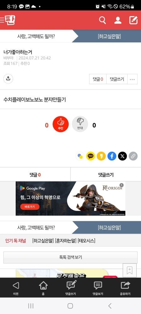 내가 배달의 민족에 옥수수 리뷰들 지우니깐, 실시간으로 옥수수찜으로 닉네임 바꾸고, 내가 하지도 않은 말들 통매음 글들 계속 올리고 정신병자야.