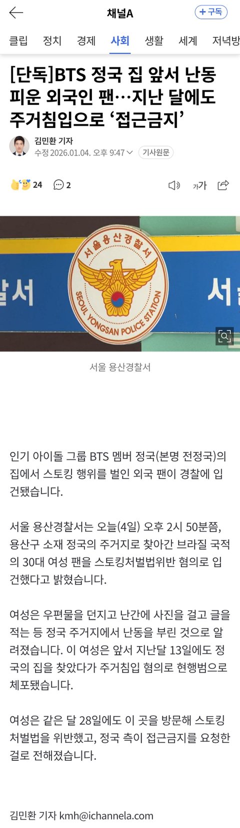 단독주택은 너무 위험함 정국이 단독주택 이사소식 들었을때도 이런 상황 예상되긴 했음 출입 확인하고 경비있는 아파트가 나은듯