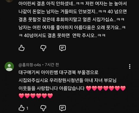 나는 이런 반응 좋은 인기댓 밖에 안 보이는데 저 이상한 댓글들 니가 달았냐? 젛아요도 없구만 용케도 저런 댓글을 찾아왔노ㅋㅋㅋㅋ