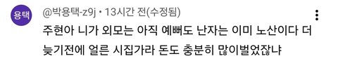유독 여자 연예인들은 30대만 넘어도 나이 공격 개오짐 남자는 나이 먹을수록 멋있다며 칭송하면서ㅋㅋㅋ 장카설도 30대 넘으면 저ㅈㄹ할 찐따ㅅㄲ들 개많을 듯 에휴.