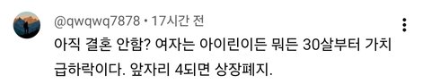 아이유 태연 윤아 제니 나연 슬기 등 30 넘었는데 여전히 다 존예들이고 요새 여자들은 30부터 시작임ㅋㅋㅋ 근데 저런 댓글들은 상대할 가치가 없어 보일 정도로 좀 모자란 인간이 쓴 글 같은데 그걸 가져오냐