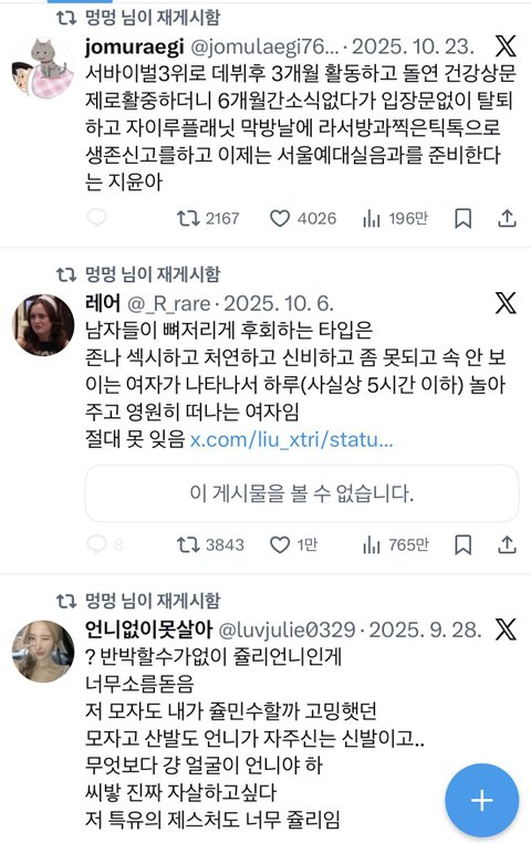 이런 트윗들 알티한 계정 그대로 복귀하려한게 ㄹㅇ신기함 뇌구조가 일반인이랑 상당히 다른것같음 굉장히 용기있는듯?