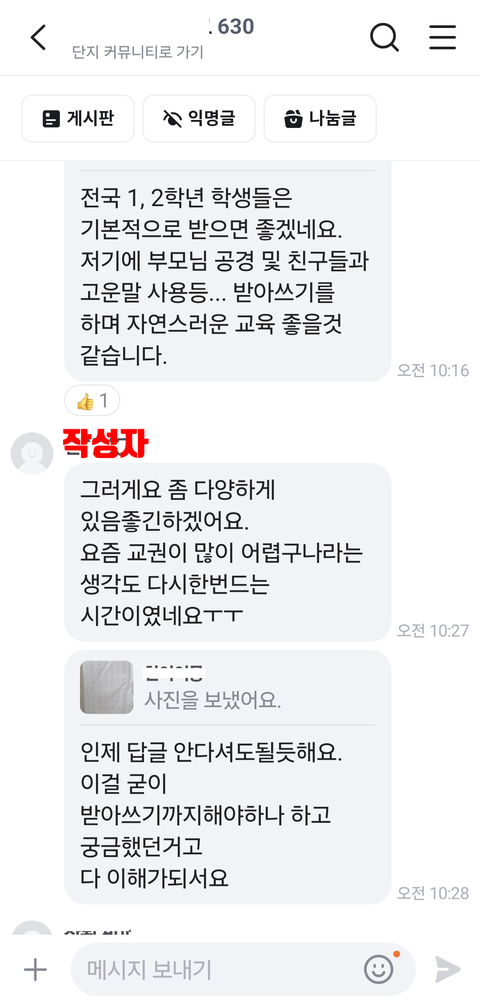 당근에는 커뮤니티 채팅방이있음그중에는 아파트 단톡방처럼 아파트 당근커뮤가 있는데, 그중 어떤 학부모가 자녀아이(초2)가방에서 받아쓰기 프린트를 발견했는데 내용이 충격적이라는듯 이해못하겠다며 글을 올림