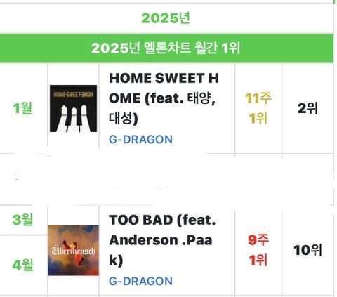 2025년 음원은 지디가 씹어먹었음 총 101회 일간 1위 18주 주간 1위 월간 1위 3회