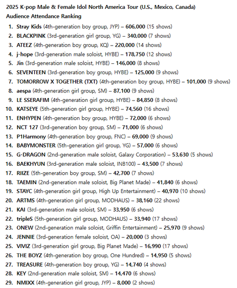 2025년 케이팝 남녀아이돌 북미투어(미국,멕시코,캐나다)관객동원 순위