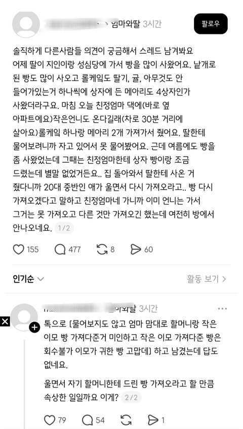 미리 물어라도 보지. 엄마 입장에서야 본인 엄마랑 동생주는거고 딸에게도 가족이니 생각했겠지만 딸은 눈보라 뚫고가서 사면서 본인 나름대로 자기 친구들이나 나눠줄 사람들이 정해져 있었거나 직접 먹고싶어서 그런거였다면 짜증날만도함. 그리고 보통 딸의 저정도 반응이면 저런일이 이미 한두번이 아닐듯.