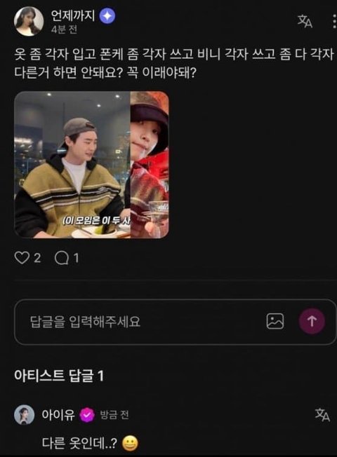 기사 나온거 보고 정리해보는데 아이유가 말하는 다른옷은 질문자가 말한거 어떻게 해석하냐에 따라 다른데 아이유는 같은옷 공유해서 입는걸로 들은거같음 그래서 다른옷이라고 말한거같고, 내 생각은 둘이 같은 커플템은 맞음 발렌시아가 제품 후드 집업 앞 무늬 패턴은 사진속 제품 밖에없고 이종석은 카키 , 아이유는 그레이 색인거같음. 그래서 아이유가 커플템이 아니라고 한게아니라 색상이 다른옷이라고 말한거같음. 24년 마르니 비니 생각하면 될거같음. 디자인은 같지만 색상만 다른것처럼