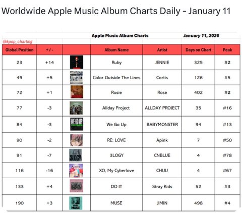 애플뮤직 전세계 앨범 차트 k팝 가수 1위