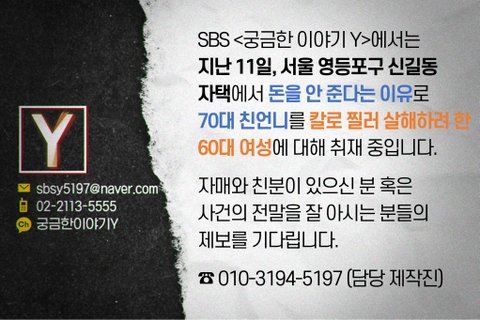 SBS는 영등포구 자택에서 친언니를 살해하려 한 60대 여성의 제보를 받습니다