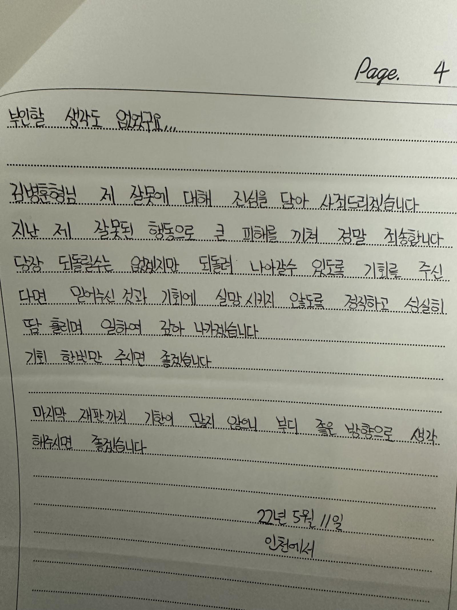 이동훈의 첫부탁은 [[[처벌 불원서]]]를 써달라는 거였습니다 저는 당연히 거절을 했었는데