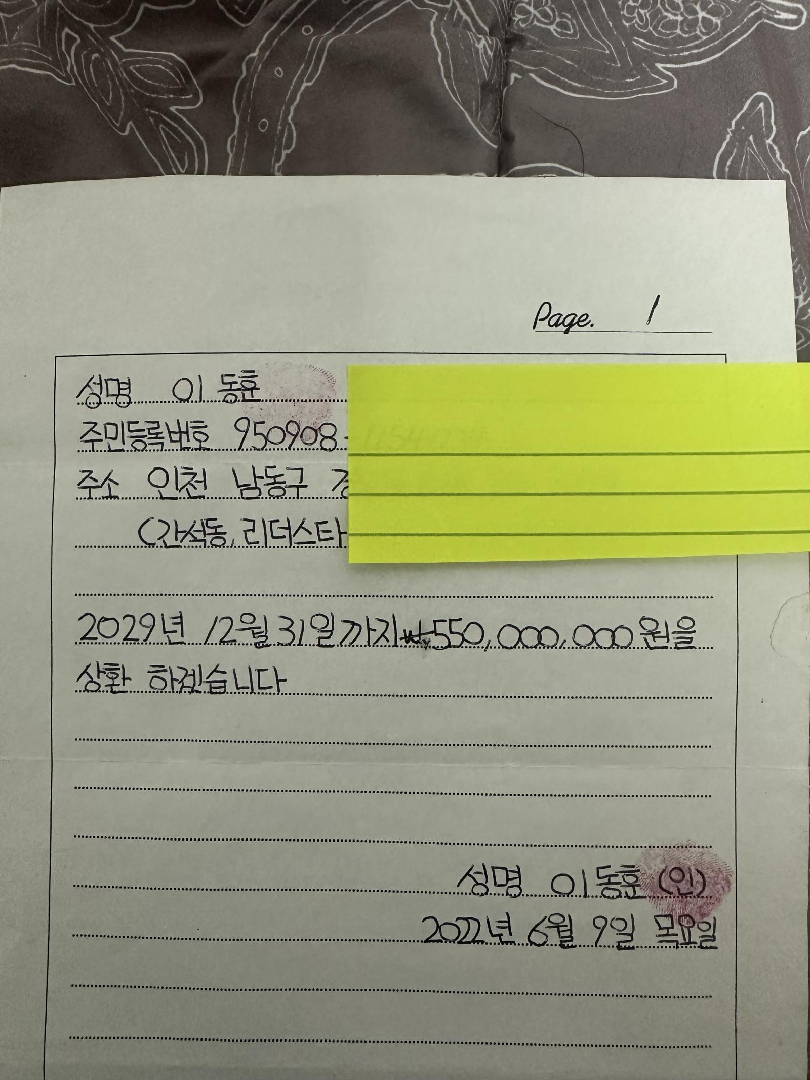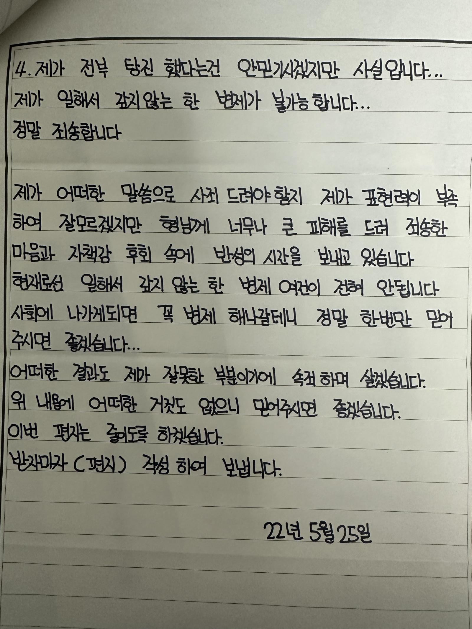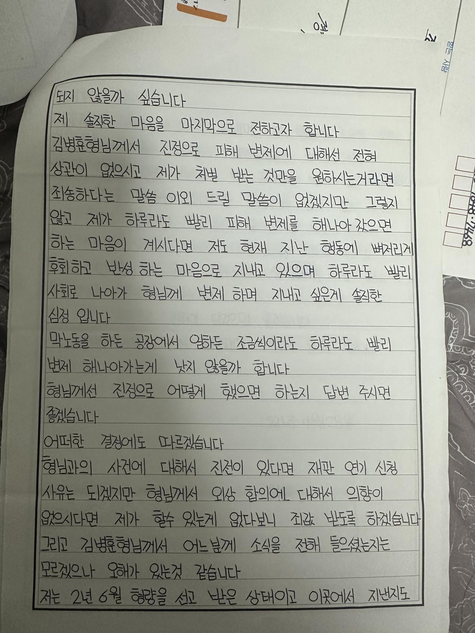 이거를 검사님께 사진을 찍어 보내자 "ㅎㅎ 걸려들었네 이제부턴 원금 + 정신적 피해 보상을 하겠다는 편지를 쓰도록 만들어보자" 하시더군요