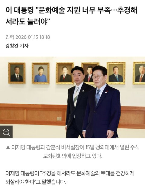 지금까지 문화예술 지원 제대로 해줬던 정치인이 없었는데 이번에는 확실히 다르긴 다르네요... 저희집은 저포함 3대가 미술,음악전공한 예술가집안인데 항상 정부지원이 부족해서 힘들었던 기억이 있는데 이젠 좀 나아지겠죠? 기대되네요