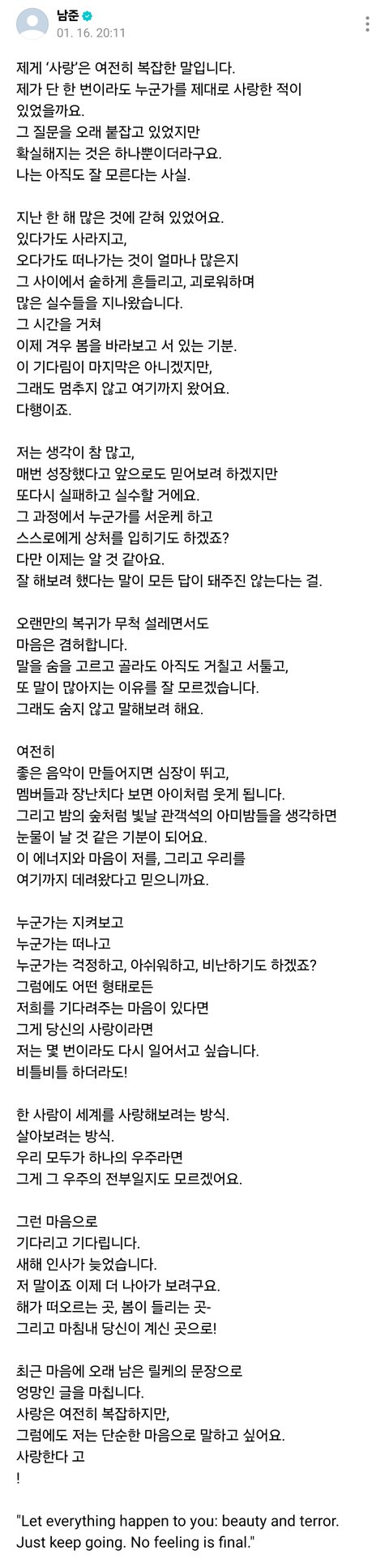 나 울었다 이거 읽고...아미이긴 한데 라이트팬이라 돈 아끼눈 덕질만 하는데 이번 투어 콘서트 어디라도 하나는 가야겠음 ㅠㅠ 2020년 부터 날 버티게 해준 원동력