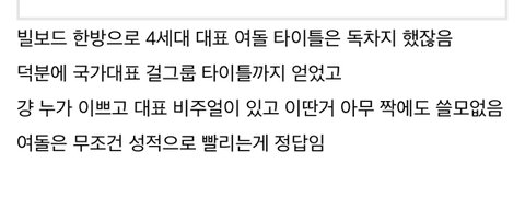 릇저씨가 말하는데 걸그룹은 비주얼,실력 따윈 필요없이시대. 오직 성적으로만 빨리는게 여돌판이라네?ㅋ또 지들이 빠는 여아이돌이 하이브인것도 자랑스러워함ㅋㅋ 자아의탁 ㅈ됨ㅋ 공수치 오짐( 아래글은 릇저씨가 쓴글 캡처본)
