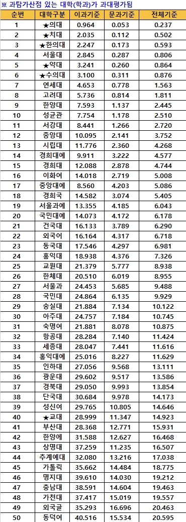 입시전문가가 추려낸 최신 대학순위 top 50이라네요 ㄷㄷ jpg
