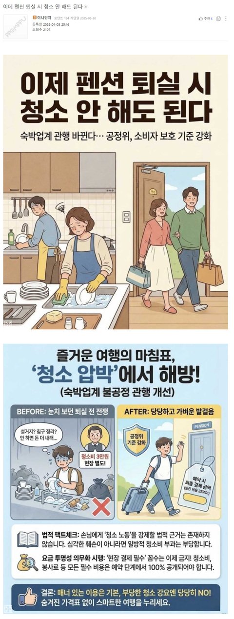 이전에 지인들과 단체로 가서 큰 펜션 빌린적있는데 청소비를 받으면서 청소도 알아서 하라해서 기분 나빳는데 이제 안해도 되는 거군요.