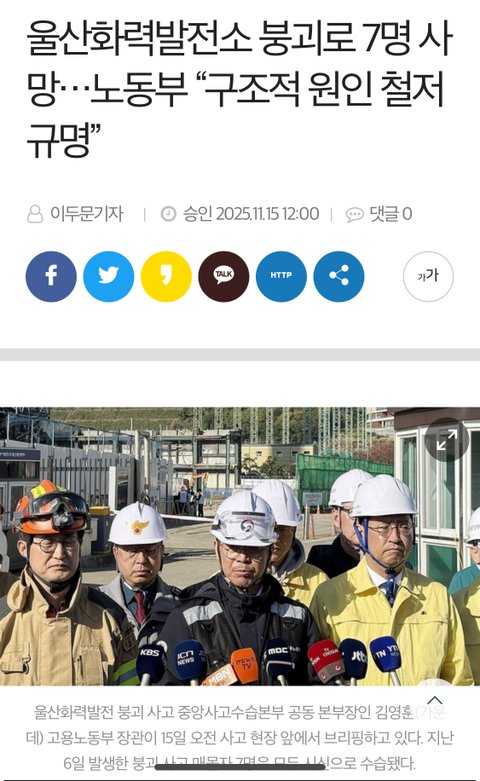 울산 화력발전소 붕괴로 7명이나 죽었네 대체 뭐 기획하다 다 죽었냐
