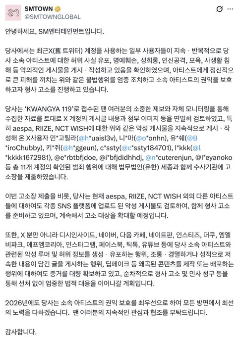 오늘자 SM 고소 공지 (트위터 고소 계정 박제)