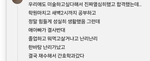 글읽는 내가 다 식겁임 미리 바꾼것도 아니고 대학 합격한 상태에서 아빠가 반대해서 미술하던애가 간호를 가노....