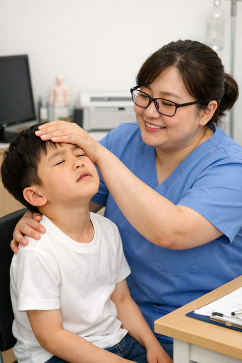 진료를 보다가 갑자기 아이의 어깨를 잡더니 이마를 탁