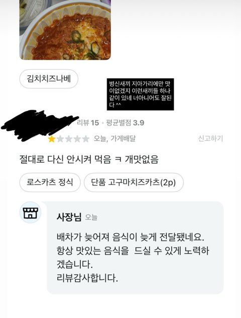 배달 리뷰라는게 맛있으면 별점 높고 안 맞으면 낮을 수 있는건데 그걸 일일이 욕으로 받아치면 그 가게는 어떤 마음으로 손님 상대하는건지 모르겠음