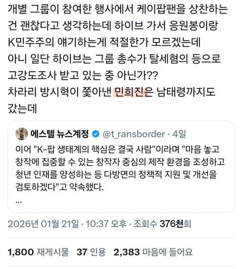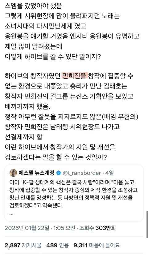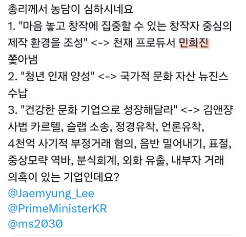 총리가 스엠을 가든 와이지를 가든 하이브를 가든 알빠아닌데 저기에 민희진을 피해자처럼 껴넣는게 신기해서 민희진 들어간 글 몇 개 가져와봄 피해자 아니잖아