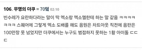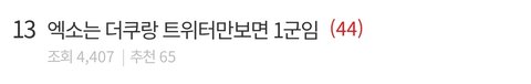 멜뮤반응좋아서 넹글돈듯 더쿠랑 트위터에서 지들은 평생 갖지못할 호감타고 엑소붐오고 알티타는거 부럽나 ㅇㅅㅇ