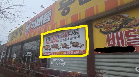 오늘 점심에 뜨끈한 국밥이 생각나서 감자탕집에 갔습니다. 가게 들어갈 때 입구에 '평일 점심 솥밥 무료 / 주문 시 갓 지은 솥밥 제공'이라고 대문짝만하게 붙어 있길래 당연히 점심 혜택 받을 생각에 들어갔습니다.