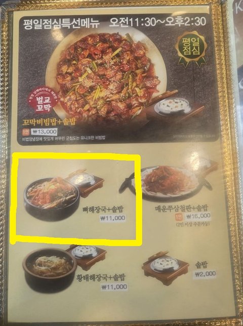 처음엔 '점심시간이 좀 지나서 솥밥이 다 떨어졌나 보다' 아니면 '바빠서 안 되나 보다' 하고 별말 없이 그냥 먹었습니다. 배도 고팠고요. 그런데 밥을 먹다 보니 메뉴판이 눈에 들어왔는데, 순간 제 눈을 의심했습니다.