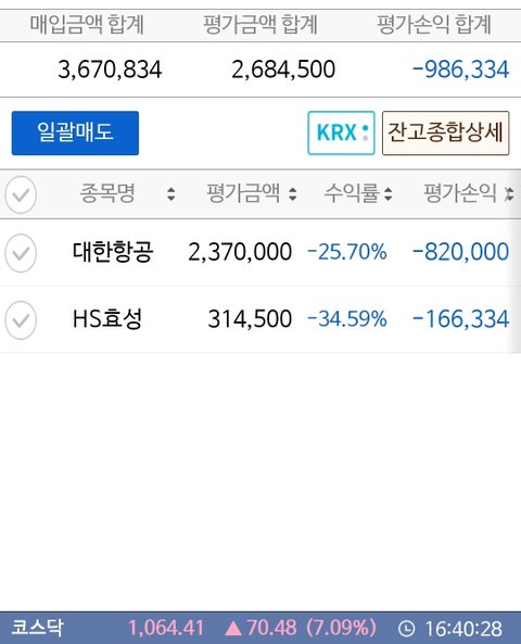 1월 26일 (오후 4시30분기준) 대한항공 -25.7% (-82만원) / HS효성 -34.6% (-16만원)