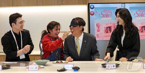 (사진2 설명) 최휘영 문화체육관광부 장관이 22일 서울 영등포구 더현대 서울 문화센터에서 진행되고 있는 코리아그랜드세일의 체험행사 '케이-소스 활용 한식 쿠킹클래스'에서 외국인 관광객이 만든 쌈밥을 맛보고 있다.(문체부 제공) <촬영정보: 셔터속도 1/160s, 초점거리 70mm, 조리개 f/4.5, 촬영감도 ISO 1250, 노출 biasing(바이어싱, Q·point(동작점) 설정) 0.0ev, M(수동, manual) 모드, 멀티패턴(multi-patterns) 측광(測光, metering), 화이트 밸런스 수동, Canon Corporation (Canon) EOS R5m2 카메라, (Canon) RF 70-200mm f/2.8 L IS USM 렌즈 사용>