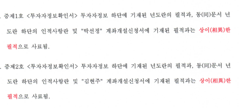 왼쪽은 문성애, 최효선 직원이 위조한 필체이고 오른쪽은 원고들의 필체