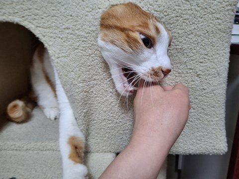 집사 손이 다가오기를 뚱한 표정으로 기다리고 있다.
