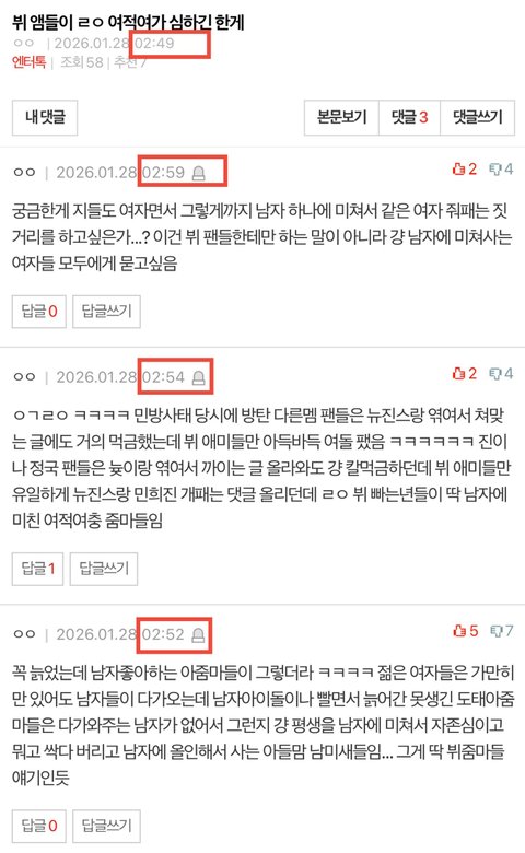 ㅇㄱㄹㅇ ㅋㅋㅋㅋ 민방사태 당시에 방탄 다른멤 팬들은 뉴진스랑 엮여서 쳐맞는 글에도 거의 먹금했는데 뷔 애미들만 아득바득 여돌 팼음 ㅋㅋㅋㅋㅋㅋ 진이나 정국 팬들은 늊이랑 엮여서 까이는 글 올라와도 걍 칼먹금하던데 뷔 애미들만 유일하게 뉴진스랑 민희진 개패는 댓글 올리던데 ㄹㅇ 뷔 빠는년들이 딱 남자에 미친 여적여충 줌마들임