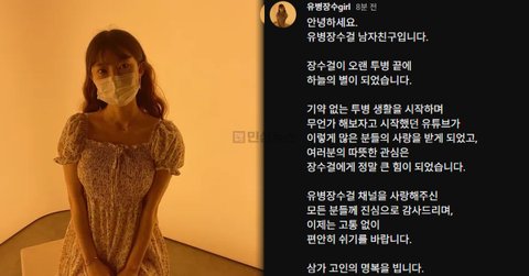 비투명세포 신장암 투병 브이로그로 알려진 유튜버 유병장수girl이 오랜 투병 끝에 세상을 떠났다. 사망 소식은 유튜브 커뮤니티를 통해 남자친구가 직접 전하며 확인됐다. 그는 투병 생활 속에서 시작한 유튜브가 많은 사랑을 받았고, 시청자들의 관심이 큰 힘이 됐다고 밝혔다.