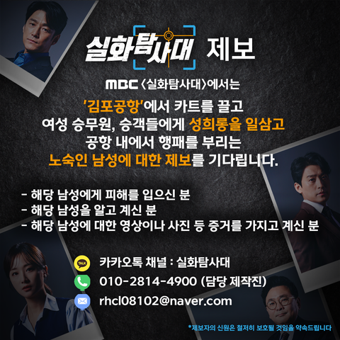 MBC <실화탐사대> 에서는'김포공항'에서 카트를 끌고여성 승무원, 승객들에게 성희롱을 일삼고공항 내에서 행패를 부리는노숙인 남성에 대한 제보를 기다립니다.