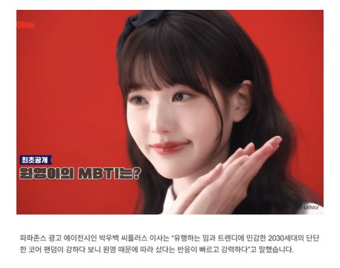 이예진 케라스타즈 마케팅 커뮤니케이션 담당자도 "장원영의 모든 것들은 전 세대에게 화제가 된다"며 "광고주는 특정 타깃만 끌어당기는 외모보다는 누구나 호감 갖는 얼굴을 선호하는데, 장원영은 Z세대부 터 50대 여성층까지 호감도가 높다"고 했습니다.