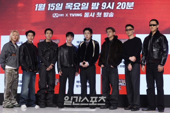 프로듀서 릴 모쉬핏, 박재범, 로꼬, 그레이, 지코, 크러쉬, 허키 사바세키, 제이통이이 15일 오전 서울 강남구 엘리에나 호텔에서 열린 Mnet 예능 '쇼미더머니12' 제작발표회에 참석해 포토타임을 갖고 있다. '쇼미더머니12'는 2012년 첫 방송 이후 수많은 스타 래퍼와 히트곡을 배출해온 대한민국 대표 힙합 서바이벌 프로그램 ‘쇼미더머니’의 열두 번째 시즌이다. 15일 밤 9시 20분 첫 방송. 서병수 기자 qudtn@edaily.co.kr /2026.01.15/