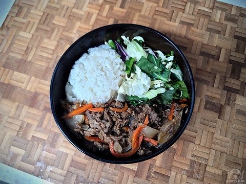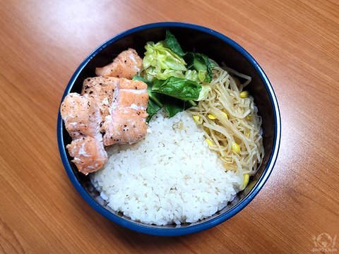 콩나물과 샐러드를 곁들인 연어 스테이크 덮밥.