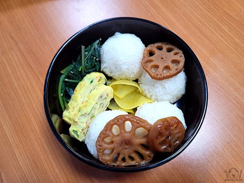 시금치무침, 달걀말이, 단무지, 연근조림.