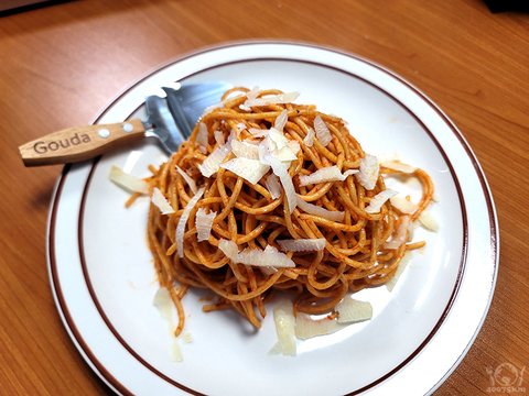 삶은 파스타를 기름에 한 번 볶고 토마토 소스에 케첩 섞어서 버무린 다음 먹기 전에 파르미지아노 뿌려 먹으면 맛있습니다.