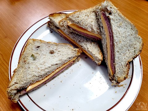 출근길에 마트에서 햄과 치즈를 사고, 사무실 냉장고에 얼려둔 식빵 위에 햄을 얹은 다음 오븐토스터에 구워줍니다.