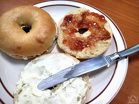 꽝꽝 언 베이글을 베이글 커터의 도움을 받아 반으로 자르고 오븐에 구운 다음 크림치즈와 딸기잼을 발라서 먹습니다.